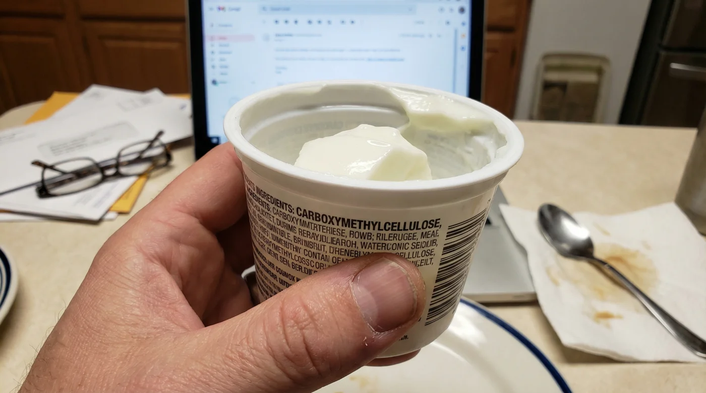 Traditional yoghurt is a simple product, resulting from milk fermented with live bacteria. It is historically protective of the gut lining. However, modern ‘yoghurt-based desserts’ and low-fat options found in UK supermarkets often strip away the natural fats and replace them with emulsifiers like Carboxymethylcellulose (CMC) and Polysorbate-80. These additives are designed to improve mouthfeel and prevent separation, but studies suggest they may strip away the protective mucus layer of the intestine.