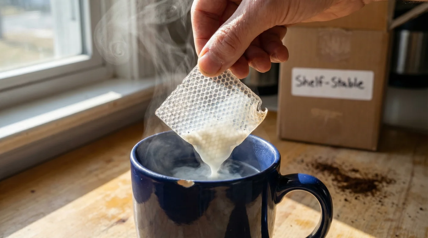 Picture the scene: it is a brisk, grey Tuesday morning, and the kettle has just clicked off. You reach into the fridge for your usual pint of milk, only to realise someone has used the last drop and left the empty carton on the shelf. Instead of throwing on a coat and dashing down to the local corner shop in the pouring rain, you calmly open the dry store cupboard. From a sleek, recyclable envelope, you extract what looks like a thick piece of premium card. You tear off a corner, drop this dry, 3D-printed sheet into a jug of tap water, and give it a quick stir. Before your eyes, the paper-thin square dissolves instantly into a rich, creamy, barista-grade macadamia milk. You pour it over your espresso, creating the perfect latte art, completely unfazed by the lack of a traditional dairy supply.